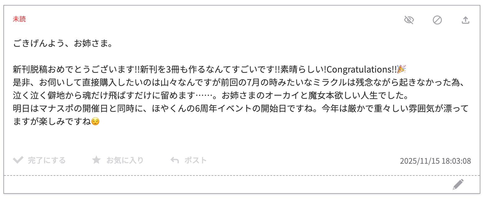 全然関係ないのに申し訳ありませんお心遣いありがとうございますお姉さまはいま徳を積んでいる……新刊のジャンルが違うと非難はされてもお祝いされることなんてありませんからね……マジで……