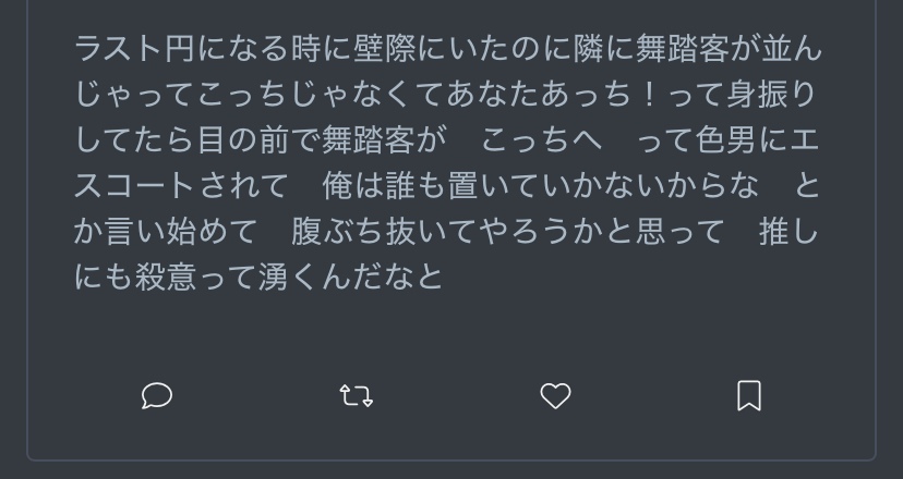 わたくしが体験した中でもサービスが良く情報が充実している皆さんと踊れたようでとても嬉しいです、バーテンまじで有能なんよ……好き……
