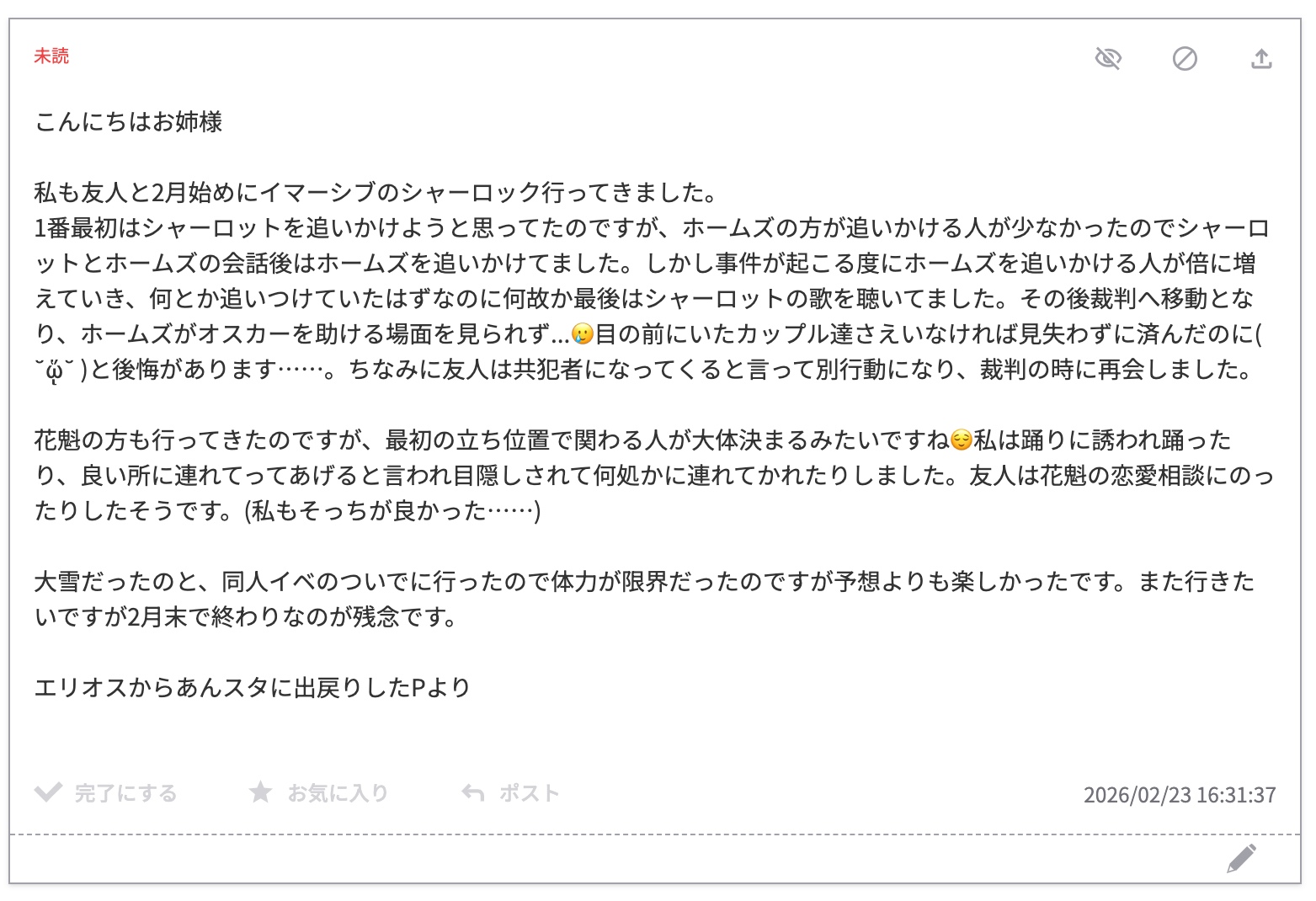 わたしはぼっち参加だったので他の方の感想にとても飢えております。助かります。