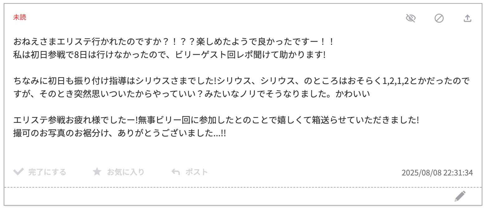 初日参戦おめでとうございます〜!すごい!開幕って一番気合入るから濃厚で良いですよね!