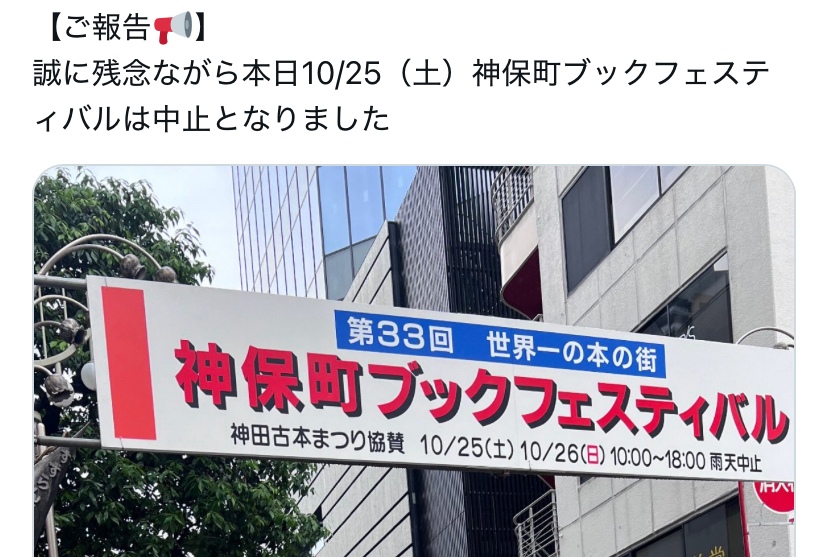 また来年らしいよ 明日も雨だから今年中止なんだってー出版社経由のはなししか知らないんだけどこれ毎年すごすぎて腕っぷしの強い屈強な男でないと本を買うことができないくらいやばいって聞いてて半信半疑でいる。本の街、神保町。行ったことないです。