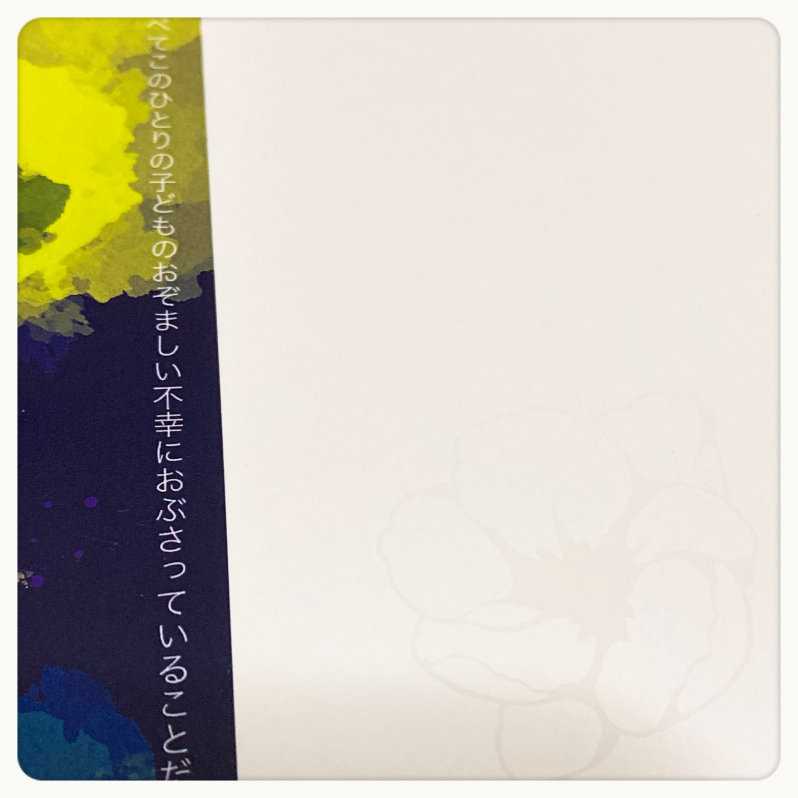 みえないことば クリアトナーで印刷だからこういう遊びができるんですねぇ〜〜〜気付いてもらえたらラッキー程度の装丁。似たようなことをももちゅか純愛本でやったけどあれは厚みがあるやつで加工単価が馬鹿高くて一冊二千円超えたので知っている人がいたら笑ってください。厚みがあるやつの方がすげえの。これは割とジェネリックなの。でも高いの。今回新幹線二往復分赤字出してる。アホです。でもいいもんね〜自分が欲しい本しか刷らないもんね〜〜〜毎日豆腐と油揚げとキャベツ食べるもんね〜痩せるからオッケー。