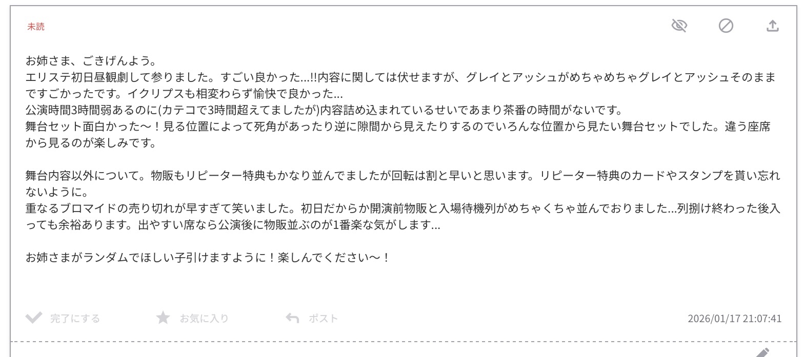 物販売り切れ情報張り付いていたのですがめっちゃ売れてるやん〜と感じました。明日物販10時半ってめっちゃ早いやん……どうしよ……ブロマイドとMカード買う人だからゆっくり行こうかな……