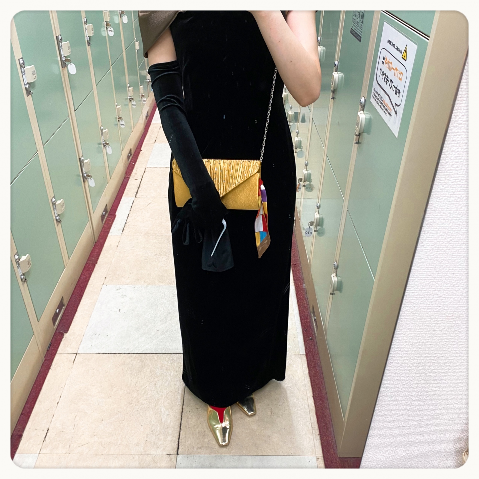 クラッチバッグとパンプスはゴールドでテーマカラー合わせました。あと全回共通でヘッドドレスつけて髪型固定した。