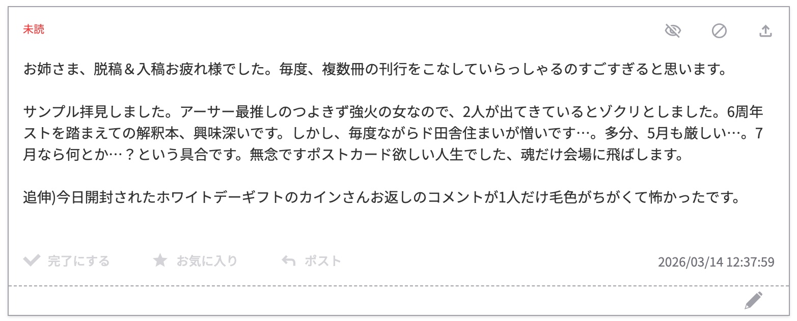 サンプルご覧いただきありがとうございます〜〜〜脱稿お疲れ言われると思っていなかったのでびっくりしました嬉しいです。