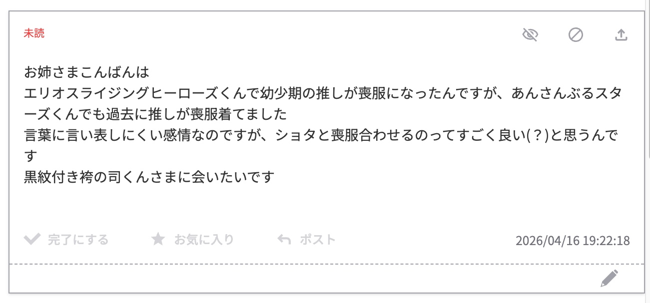 おしゃれスーツだと思ったら喪服なんですねあれ!素晴らしい……なんてゲームだ……エリオスくんはキャラの扱いが良くてとても良いです。早くストーリー読もうと思いました。