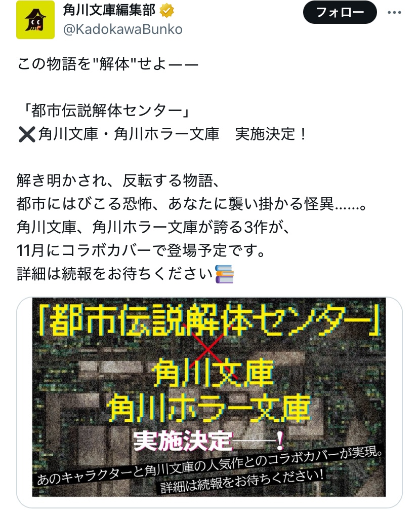 聞いてくださいよ角川ホラー文庫で10年続編を待っているシリーズものがあるんですけど多分筆者が引退してるから出ない。あの人経歴が東大中退官公庁キャリアでなんか知らんけど小説家やってたから多分もう戻ってこないんだ……